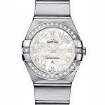 Basic Information ID: 123.15.24.60.55.005 Brand: Omega Series: Constellation Movement Type: Quartz Gender: Ladies Movement Model: Cal.1376 Movement Type: Quartz Manufacturer: Omega Movement Diameter: 9 x 15.15 mm Movement Thickness: 1.8 mm Number of Jewels: 5 Battery Life: 4 years Case Diameter: 24 mm Case Thickness: 8.1 mm Dial Color: Silver-grey Dial Shape: Round Strap Color: Silver Clasp Type: Butterfly Clasp Case Back: Solid Weight: 67 grams Water Resistance: 100 meters Hour Markers: Diamond Hour Markers Clasp Spacing: Not available Lug Spacing: 16 mm Materials: Case Material: Stainless Steel Dial Material: Mother-of-Pearl, Diamond-set Bezel Material: Stainless Steel, Diamond-set Crystal Material: Domed, scratch-resistant sapphire crystal with anti-reflective coating Crown Material: Stainless Steel Strap Material: Stainless Steel Clasp Material: Stainless Steel Functions: This watch has no other special functions.