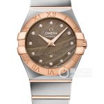 Basic Information ID: 123.20.27.60.63.003 Brand: Omega Series: Constellation Movement Type: Quartz Gender: Ladies Movement Model: Cal.1376 Movement Type: Quartz Manufacturer: Omega Movement Diameter: 9 x 15.15 mm Movement Thickness: 1.8 mm Number of Jewels: 5 Battery Life: 4 years Case Diameter: 27 mm Case Thickness: 8.7 mm Dial Color: Dark Brown Dial Shape: Round Strap Color: Two-tone Clasp Type: Butterfly Clasp Case Back: Solid Weight: 87 grams Water Resistance: 100 meters Hour Markers: Diamond Hour Markers Clasp Spacing: Not Available Lug Spacing: 18 mm Material: Case Material: Stainless Steel Dial Material: Nutrite lacquered dial with a feather pattern, the feather pattern meandering between the iconic “claws”. The dial is decorated with 12 diamond hour markers. The bezel is made of 18K red gold, the crystal is a domed, scratch-resistant sapphire crystal with an anti-reflective coating, the crown is made of 18K red gold, and the bracelet is made of stainless steel/18K red gold with a two-tone finish. The buckle is currently unavailable. This watch has no other special functions.