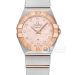 Basic Information ID: 123.25.27.20.57.005 Brand: Omega Series: Constellation Movement Type: Automatic Gender: Ladies Movement Model: 8520 Movement Type: Automatic Manufacturer: Omega Movement Diameter: 20mm Movement Thickness: 5.3mm Balance Wheel: Free-sprung Balance Spring Frequency: 25,200 vibrations per hour Hair Spring: Si 14 silicon Jewels: 28 Power Reserve: 50 hours Technical Certifications: Swiss Official Chronometer Testing Institute (COSC) Appearance: Case Diameter: 27mm Case Thickness: 12.3mm Dial Color: Pink Dial Shape: Round Strap Color: Two-tone Clasp Type: Butterfly Clasp Case Back: Transparent Weight: 99kg Water resistance: 100 meters; Hour marker type: Diamond-set; Clasp spacing: Not available; Lug spacing: Not available; Materials: Case material: Stainless steel; Dial material: Pink mother-of-pearl with diamonds; Bezel material: 18k gold with diamonds; Crystal material: Domed double-sided anti-reflective, scratch-resistant sapphire crystal; Crown material: 18k gold; Strap material: 18k gold/stainless steel; Two-tone; Clasp material: Not available; Functions: Date display