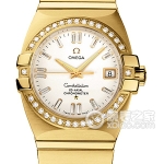 Basic Information ID: 123.50.31.20.08.001 Brand: Omega Series: Constellation Movement Type: Automatic Mechanical Gender: Ladies’ Movement: Movement Model: 8521 Movement Type: Automatic Mechanical Manufacturer: Omega Movement Diameter: 20mm Movement Thickness: 5.3mm Balance Wheel: Free-sprung Balance Spring Frequency: 25,200 vibrations per hour Hair Spring: Silicon SI 14 Free-sprung Balance Spring Jewels: 28 Power Reserve: 50 hours Technical Certifications: Swiss Official Chronometer Testing Institute (COSC) Appearance: Case Diameter: 31mm Case Thickness: Not Available Dial Color: Champagne Dial Shape: Round Strap Color: Gold Clasp Type: Folding Clasp Case Back: Transparent Weight: Not Available Water Resistance: 100 meters Hour Marker Type: Bat Hour Markers Clasp Spacing: Not Available Lug Spacing: 19 18k gold case material, dial material not specified, 18k gold bezel, domed double-sided anti-reflective and scratch-resistant sapphire crystal, 18k gold crown, 18k gold strap, 18k gold buckle, 18k gold functions, date display.