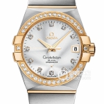 Basic Information ID: 123.55.35.20.52.002 Brand: Omega Series: Constellation Movement Type: Automatic Mechanical Gender: Men’s Movement Model: 2500 Movement Type: Automatic Mechanical Manufacturer: Omega Base Movement: ETA 2892-2 Movement Diameter: 25.6 mm Movement Thickness: 3.6 mm Frequency: 25,200 vibrations per hour Number of Jewels: 27 Power Reserve: 48 hours Technical Certifications: Swiss Official Chronometer Testing Institute (COSC) Appearance: Case Diameter: 35 mm Case Thickness: Not Available Dial Color: Silver Dial Shape: Round Strap Color: Gold Clasp Type: Folding Clasp Case Back: Transparent Weight: Not Available Water Resistance: 100 meters Hour Marker Type: Diamond-set Hour Markers Clasp Spacing: Not Available Lug Spacing: 23 18k gold case material; dial material not specified; bezel material: 18k gold with diamonds; crystal material: domed, scratch-resistant sapphire crystal with anti-reflective coating; crown material: 18k gold; strap material: 18k gold; buckle material: 18k gold; functions: date display.