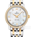 Basic Information ID: 424.55.33.20.55.002 Brand: Omega De Ville Gender: Ladies Movement: Movement Model: 2500 Manufacturer: Omega Technical Certification: Swiss Official Chronometer Testing Institute (COSC) Appearance: Case Diameter: 32.7 mm Case Thickness: Not Available Dial Color: White Dial Shape: Round Strap Color: Gold Clasp Type: Folding Clasp Case Back: Transparent Weight: Not Available Water Resistance: 30 meters Hour Markers: Diamond-set Roman numerals Clasp Spacing: Not Available Lug Spacing: 16 mm Material: Case Material: 18K Red Gold Dial Material: White mother-of-pearl concentric circle dial with diamond hour markers and gold Roman numeral hour markers at 6, 9, and 12 o’clock Bezel Material: 18K Red Gold with Diamonds Crystal Material: Domed, scratch-resistant sapphire crystal with anti-reflective coating Crown Material: 18K Red Gold Strap Material: 18K Red Gold Clasp Material: 18K Red Gold Functions: Date Display