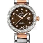 Basic Information Number: 425.25.34.20.63.001 Brand: Omega Series: Disc-shaped movement Type: Automatic mechanical Gender: Ladies’ movement Movement Model: 8520 Movement Type: Automatic mechanical Manufacturer: Omega Movement Diameter: 20 mm Movement Thickness: 5.3 mm Balance Wheel: Free-sprung balance spring Balance Wheel Frequency: 25,200 rpm Number of oscillations per hour: Si 14-piece silicon hairspring, 28 jewels, 50-hour power reserve, Swiss Official Chronometer Testing Institute (COSC) certification. Case diameter: 34mm, Case thickness: Not available. Dial color: Dark brown. Dial shape: Round. Strap color: Two-tone. Clasp type: Folding clasp. Case back: Transparent. Weight: Not available. Water resistance: 100 meters. Hour markers: Diamond-set. Clasp spacing: Not available. Lug spacing: Not available. Materials: Case material: Stainless steel. Dial material: Diamond hour markers with sunray pattern. Bezel material: 18K red gold with diamonds. Crystal material: Sapphire crystal. Crown material: 18K red gold. Strap material: Stainless steel – 18K red gold; two-tone. Clasp material: Stainless steel. Functions: Date display.