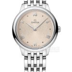 Basic Information ID: 434.10.28.60.09.001 Brand: Omega Series: Disc Airplane Movement Type: Quartz Gender: Ladies Movement Model: 4061 Movement Type: Quartz Manufacturer: Omega Battery Life: 4 years Appearance: Case Diameter: 27.5 mm Case Thickness: 6.3 mm Dial Color: Linen Dial Shape: Round Strap Color: Silver Clasp Type: Butterfly Clasp Case Back: The case back features an embossed Chronos pattern Weight: 57 grams Water Resistance: 30 meters Hour Marker Type: Roman Numerals Clasp Spacing: Not available Lug Spacing: 13 mm Material: Case Material: Stainless Steel Dial Material: The dial is treated with a linen-colored PVD coating, featuring irregularly arranged vertical textures that create a sunray-like finish. Featuring rhodium-plated hands, alternating Roman numeral hour markers and domed hour markers; bezel made of stainless steel; crystal is a domed, scratch-resistant sapphire crystal with anti-reflective coating; crown is made of stainless steel; bracelet is made of stainless steel; buckle is not currently available. This watch has no other special functions.