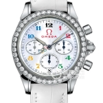 Basic Information ID: 4877.72.36 Brand: Omega Series: Disc-shaped Movement Type: Automatic Mechanical Gender: Ladies’ Movement: Cal.3313 Movement Type: Automatic Mechanical Manufacturer: Omega Base Movement: Frederic Piguet 1185 Movement Diameter: 27mm Movement Thickness: 6.85mm Balance Wheel: Free-sprung Frequency: 28,800 vibrations per hour Jewels: 37 Power Reserve: 52 hours Technical Certification: Swiss Official Chronometer Testing Institute (COSC) Appearance: Case Diameter: 35mm Case Thickness: 8mm Dial Color: Blue Dial Shape: Round Strap Color: White Clasp Type: Folding Clasp Case Back: Transparent Weight: Not available Water Resistance: 30 meters Hour Marker Type: Bat-shaped Hour Markers/Diamond-set Clasp Spacing: Not available Lug Spacing: Not available Materials: Case Material: Stainless Steel Dial Material: Mother-of-Pearl Bezel Material: Stainless Steel Diamond-set Crystal Material: Sapphire Crystal Glass Crown Material: Stainless Steel Strap Material: Leather Clasp Material: Stainless Steel Functions: Date Display, Chronograph