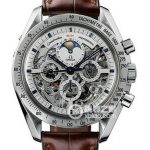 Basic Information: ID: 3688.30.32; Brand: Omega; Series: Speedmaster; Movement Type: Manual Mechanical; Gender: Men’s; Limited Edition: 57; Movement: Cal. 3604; Movement Type: Manual Mechanical; Manufacturer: Omega; Base Movement: Lemania 1884; Jewels: 18; Power Reserve: 48 hours; Technical Certification: Swiss Official Chronometer Testing Institute (COSC); Appearance: Case Diameter: 38.8 mm; Case Thickness: 14.3 mm; Dial Color: Skeletonized; Dial Shape: Round; Strap Color: Dark Brown; Clasp Type: Folding Clasp; Case Back: Transparent; Weight: Not Available; Water Resistance: 30 meters; Hour Marker Type: Bat; Clasp Spacing: Not Available; Lug Spacing: Not Available; Materials: Case Material: 18k White Gold; Dial Material: Yellow Gold with a silver dial and blue gold hour markers; red limited edition number below 12 o’clock; Bezel Material: 18k White Gold; Crystal Material: Sapphire Crystal; Crown Material: 18k White Gold; Strap Material: Alligator Leather; Clasp Material: 18k White Gold; Functions: Moon Phase, Chronograph