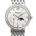 Basic Information Number 4958/1G-001 Platinum Brand Patek Philippe Series Complications Movement Type Manual Mechanical Gender Ladies Movement Model Cal.16-250 PS LU Movement Type Manual Mechanical Manufacturer Patek Philippe Movement Diameter 20 mm Movement Thickness 2.95 mm Balance Wheel Annular Frequency 28,800 vibrations per hour Number of Jewels 18 Number of Parts 115 Power Reserve 38 hours Technical Certifications Geneva Seal Appearance Case Diameter: 31 mm Case Thickness: 8 mm Dial Color: Silver-white Dial Shape: Round Strap Color: Silver Clasp Type: Folding Clasp Case Back: Transparent Case Back, Sapphire Crystal Weight: Not Available Water Resistance: 30 meters In 2024, Patek Philippe implemented a new water resistance standard; this rating indicates the depth to which the watch can be submerged. Hour marker type: Diamond-set hour markers; Clasp spacing: Not available; Lug spacing: Not available; Materials: Case material: 18k white gold; Dial material: Mother-of-pearl, diamond hour markers and gold Breguet numerals; Bezel material: 18k white gold with diamonds; Crystal material: Sapphire crystal glass; Crown material: 18k white gold; Strap material: 18k white gold; Clasp material: 18k white gold; Function: Moon phase; Thanks to the enthusiastic netizens hwjacky and Xiaomutou Oliver for correcting the product parameters.