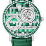 Basic Information Number: G0A49118 Brand: Piaget High Jewelry Watch Movement Type: Manual Mechanical Gender: Ladies Limited Edition: 8 Movement Model: 670P Movement Type: Manual Mechanical Manufacturer: Piaget Movement Diameter: 30.6 mm Movement Thickness: 4.6 mm Frequency: 21,600 vibrations per hour Jewels: 23 Number of Parts: 157 Power Reserve: 48 hours Exterior Case Diameter: 41 mm Case Thickness: Not Available Dial Color: Green Dial Shape: Round Strap Color: Green Clasp Type: Not Available Case Back: Transparent Weight: Not Available Water Resistance: Not Available Hour Marker Type: None Hour Marker Spacing: Not Available Lug Spacing: Not Available Materials Case Material: 18k white gold set with emeralds, malachite, and diamonds Dial Material: Not Available Bezel Material: Diamond-set Crystal Material: Sapphire Crystal Glass Crown Material: Diamond-set Strap Material: Alligator Leather Clasp Material: 18k White Gold Function: Tourbillon