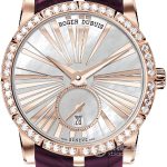 Basic Information ID: RDDBEX0789 Brand: Roger Dubuis Series: King of Kings Movement Type: Automatic Gender: Ladies Movement Type: Automatic Appearance: Case Diameter: 34mm Case Thickness: Not Available Dial Color: Silver White Dial Shape: Round Strap Color: Purple Clasp Type: Not Available Case Back: Not Available Weight: Not Available Water Resistance: 30 meters Hour Marker Type: Roman Numerals Clasp Spacing: Not Available Lug Spacing: Not Available Materials: Case Material: 18k Rose Gold Dial Material: Not Available Bezel Material: 18k Rose Gold with Diamonds Crystal Material: Sapphire Crystal Crown Material: Not Available Strap Material: Not Available Clasp Material: Not Available Functions: Date Display