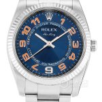 Basic Information ID 114234 Blue Dial Brand Rolex Series Air-King Movement Type Automatic Mechanical Gender Men’s Movement Movement Model 3130 Movement Type Automatic Mechanical Manufacturer Rolex Power Reserve 48 Hours Technical Certification Superlative Chronometer Certification Appearance Case Diameter: 34 mm Case Thickness: Not Available Dial Color: Blue Dial Shape: Round Strap Color: Silver Clasp Type: Folding Clasp Case Back: Solid Case Back Weight: Not Available Water Resistance: 100 meters Hour Marker Type: Arabic Numerals Clasp Spacing: Not Available Lug Spacing: Not Available Materials Case Material Stainless Steel – 18k White Gold Dial Material: Not Available Bezel Material: Knurled Outer Bezel Crystal Material: Sapphire Crystal Glass Crown Material: Not Available Strap Material: Stainless Steel Clasp Material: Stainless Steel – 18k White Gold Functions This watch has no other special functions.