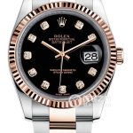 Basic Information ID 116231 Black Dial Diamond-Set Oyster Strap Brand Rolex Series Datejust Movement Type Automatic Mechanical Gender Men’s Movement Movement Model 3135 Movement Type Automatic Mechanical Manufacturer Rolex Hairspring Parachrom Hairspring with 48-hour Power Reserve Technical Certification Swiss Observatory Certification Appearance Case Diameter: 36 mm Case Thickness: 12 mm Dial Color: Black Dial Shape: Round Strap Color: Two-tone Clasp Type: Folding Clasp Case Back: Solid Case Back Weight: Not Available Water Resistance: 100 meters Hour Markers Type: Diamond-Set Hour Markers Clasp Spacing: Not Available Lug Spacing: Not Available Materials Case Material: Stainless Steel Dial Material: Diamond-Set Bezel Material: 18k Rose Gold, Fluted Bezel Crystal Material: Sapphire Crystal Glass Crown Material: 18k Rose Gold Strap Material: 18k Rose Gold, Stainless Steel; Two-tone Clasp Material: Stainless Steel Functions: Large Date