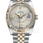 Basic Information Number 116243-0008 Silver Flower Dial Brand Rolex Series Datejust Movement Type Automatic Mechanical Gender Unisex Movement Model 3135 Movement Type Automatic Mechanical Manufacturer Rolex Hairspring Parachrom Hairspring with blue color Power Reserve 48 hours Technical Certification Superlative Chronometer Certification Appearance Case Diameter: 36 mm Case Thickness: 12 mm Dial Color: Silver Dial Shape: Round Strap Color: Two-tone Clasp Type: Oyster Clasp with 5 mm Easylink Extension System Case Back: Solid Case Back Weight: Not available Water Resistance: 100 meters Hour Marker Type: Arabic numerals Clasp Spacing: Not available Lug Spacing: Not available Materials Case Material: Stainless Steel Dial Material: Silver Flower Dial Bezel Material: 18k Yellow Gold with Diamond-set Outer Ring Crystal Material: Scratch-resistant Sapphire Crystal Glass with Anti-reflective Cyclops Magnifying (2.5x) Date Window Crown Material: 18k Yellow Gold Strap Material: 18k Yellow Gold/Stainless Steel; Two-tone, Oyster, Three-link Clasp Material: Not available Functions: Date Display