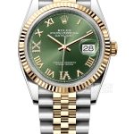 Basic Information Number: m126233-0025 Brand: Rolex Series: Datejust Movement Type: Automatic Mechanical Gender: Unisex Movement Model: 3235 Movement Type: Automatic Mechanical Manufacturer: Rolex Hairspring: Paramagnetic Blue Parachrom Hairspring Shock-resistant: High-performance Paraflex shock absorber Power Reserve: 70 hours Technical Certifications: Superlative Chronometer Certification Appearance: Case Diameter: 36 mm Case Thickness: Not Available Dial Color: Green Dial Shape: Round Strap Color: Two-tone Clasp Type: Oysterclasp with 5 mm Easylink extension system Case Back: Solid Case Back Weight: Not Available Water Resistance: 100 meters Hour Markers: Roman numerals/diamond-set Clasp Spacing: Not Available Lug Spacing: Not Available Material: Case Material: 904L Stainless Steel (Oystersteel) Dial material: Diamond-set 6 and 9 o’clock markers; 18ct gold bezel with fluted bezel; Scratch-resistant sapphire crystal; Screw-down crown with Twinlock double waterproof system; Bracelet: 18ct gold/904L stainless steel (Oystersteel), two-tone; Jubilee model, five-link clasp: 18ct gold/904L stainless steel (Oystersteel); Functions: Date display, large date.