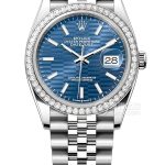 Basic Information Number: m126284rbr-0041 Brand: Rolex Series: Datejust Movement Type: Automatic Mechanical Gender: Ladies’ Movement: 3235 Movement Type: Automatic Mechanical Manufacturer: Rolex Hairspring: Paramagnetic Blue Parachrom Hairspring Shock Absorption: High-performance Paraflex shock absorber Power Reserve: 70 hours Technical Certifications: Superlative Chronometer Certification Appearance: Case Diameter: 36 mm Case Thickness: Not Available Dial Color: Bright Blue Dial Shape: Round Strap Color: Silver Clasp Type: Folding Oysterclasp with 5 mm Easylink extension system Case Back: Not Available Weight: Not Available Water Resistance: 100 meters Hour Marker Type: Bat-shaped Hour Markers Clasp Spacing: Not Available Lug Spacing: Not Available Materials: Case Material: Steel Dial Material: Knurled Bezel Material: White Gold Bezel with Diamonds Crystal Material: Scratch-resistant Sapphire Crystal Crown Material: Screw-down, Twinlock Double Water Resistance System Strap Material: Oystersteel, Jubilee, Five-link Clasp Material: Oystersteel Functions: Date Display