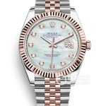 Basic Information Number: m126331-0014 Brand: Rolex Series: Datejust Movement Type: Automatic Gender: Men’s Movement Model: 3235 Movement Type: Automatic Manufacturer: Rolex Hairspring: Paramagnetic, Blue Parachrom Hairspring Shock Absorption: High-Performance Paraflex Shock Absorption Power Reserve: 70 Hours Technical Certifications: Superlative Chronometer Certification Appearance: Case Diameter: 41mm Case Thickness: Not Available Dial Color: White Dial Shape: Round Strap Color: Two-Tone Clasp Type: Oyster Clasp Case Back: Solid Weight: Not Available Water Resistance: 100 meters Hour Markers: Diamond-set Hour Marker Spacing: Not Available Lug Spacing: Not Available Materials: Case Material: Stainless Steel Dial Material: White Mother-of-Pearl with Diamonds Bezel Material: 18k Rose Gold Crystal Material: Sapphire Crystal Crown Material: 18k Rose Gold Strap Material: 18k Rose Gold & Stainless Steel; Two-Tone Clasp Material: Stainless Steel Functions: Date Display
