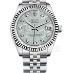 Basic Information Number: m178344-0013 Brand: Rolex Series: Datejust Movement Type: Automatic Gender: Women’s Movement Model: Cal.2235 Movement Type: Automatic Manufacturer: Rolex Movement Diameter: 20mm Movement Thickness: 5.95mm Frequency: 28,800 vibrations per hour Hairspring: Parachrom Shock Absorber: Paraflex Jewel count: 31; Power reserve: 48 hours; Technical certification: Superlative Chronometer; Appearance: Case diameter: 31 mm; Case thickness: Not available; Dial color: Black; Dial shape: Round; Strap color: Silver; Clasp type: Folding clasp, Oyster clasp with 5 mm Easylink extension system; Case back: Solid; Weight: Not available; Water resistance: 100 meters; Hour markers: Roman numerals; Clasp spacing: Not available; Lug spacing: Not available; Materials: Case material: 18k white gold with diamonds/stainless steel, domed, diamond-set bezel; Dial material: Roman numerals; Bezel material: Not available; Crystal material: Scratch-resistant sapphire crystal, anti-reflective; Cyclops lens (2.5x) for date window; Crown material: Not available; Strap material: Stainless steel, Oyster, three-link clasp; Clasp material: Not available; Functions: Date display