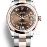 Basic Information Number: m278241-0003 Brand: Rolex Series: Datejust Movement Type: Automatic Mechanical Gender: Ladies’ Movement: 2236 Movement Type: Automatic Mechanical Manufacturer: Rolex Power Reserve: 55 hours Technical Certification: Superlative Chronometer Certification Appearance: Case Diameter: 31 mm Case Thickness: Not available Dial Color: Chocolate Dial Shape: Round Strap Color: Two-tone Clasp Type: Folding Oysterclasp with 5 mm Easylink Extension System Case Back: Screw-down Case Back Weight: Not available Water Resistance: 100 meters Hour Markers: Roman Numerals Clasp Spacing: Not available Lug Spacing: Not available Materials: Case Material: Oystersteel Dial Material: Enlarged VI Roman Numerals with Diamonds Bezel Material: 18ct Everose Gold Crystal Material: Scratch-resistant Sapphire Crystal with Cyclops Lens for Date Count Crown Material: Screw-down Twinlock Double Water Resistance System Strap Material: Everose Steel (Oystersteel and 18ct Everose Gold), Two-tone; Oyster, Three-link Clasp Material: Oystersteel Functions: Date Display