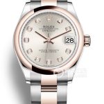 Basic Information Number: m278241-0015; Brand: Rolex; Series: Datejust; Movement Type: Automatic; Gender: Women’s; Movement Model: 2236 Movement Type: Automatic Mechanical; Manufacturer: Rolex; Power Reserve: 55 Hours; Technical Certification: Superlative Chronometer Certification; Appearance: Case Diameter: 31mm; Case Thickness: Not Available; Dial Color: Silver; Dial Shape: Round; Strap Color: Two-Tone; Clasp Type: Folding Oysterclasp with 5mm Easylink Extension System; Case Back: Screw-Down Case Back; Weight: Not Available; Water Resistance: 100 Meters; Hour Markers: Diamond-Set; Clasp Spacing: Not Available; Lug Spacing: Not Available; Materials: Case Material: Oystersteel; Dial Material: 18ct Gold with Diamond Setting; Bezel Material: 18ct Everose Gold; Crystal Material: Scratch-Resistant Sapphire Crystal with Cyclops Lens for Date Magnification; Crown Material: Screw-Down Twin Lock Double Water Resistance System; Strap Material: Everose Steel (Oystersteel and 18ct Everose Gold), Two-Tone; Oyster, Three-Link Clasp Material: Oystersteel; Functions: Date Display