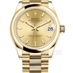 Basic Information Number: m278248-0028 Brand: Rolex Series: Datejust Movement Type: Automatic Gender: Ladies Movement Model: 2236 Movement Type: Automatic Manufacturer: Rolex Power Reserve: 55 hours Technical Certification: Superlative Chronometer Certification Appearance: Case Diameter: 31 mm Case Thickness: Not available Dial Color: Silver Dial Shape: Round Strap Color: Gold Clasp Type: Concealed Folding Crown Buckle Case Back: Screw-down Case Back Weight: Not available Water Resistance: 100 meters Hour Markers: Roman numerals/diamond-set Clasp Spacing: Not available Lug Spacing: Not available Materials: Case Material: 18ct gold Dial Material: Enlarged VI Roman numerals with diamonds Bezel Material: Domed outer ring Crystal Material: Scratch-resistant sapphire crystal with Cyclops lens for magnification of date Crown Material: Screw-down Twinlock double waterproof system Strap Material: 18ct gold, President type, three-link clasp Clasp Material: 18ct gold Functions: Date display
