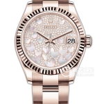 Basic Information Number: m278285rbr-0007 Brand: Rolex Series: Datejust Movement Type: Automatic Mechanical Gender: Ladies’ Movement: 2236 Movement Type: Automatic Mechanical Manufacturer: Rolex Power Reserve: 55 hours Technical Certification: Superlative Chronometer Certification Appearance: Case Diameter: 31 mm Case Thickness: Not Available Dial Color: White Dial Shape: Round Strap Color: Gold Clasp Type: Concealed Folding Crown Buckle Case Back: Solid Case Back Weight: Not Available Water Resistance: 100 meters Hour Markers: Roman Numerals Clasp Spacing: Not Available Lug Spacing: Not Available Materials: Case Material: 18ct Everose Gold Dial Material: Not Available Bezel Material: Diamond Set Crystal Material: Scratch-resistant Sapphire Crystal Crown Material: Screw-down, Twinlock Double Water Resistance System Strap Material: 18ct Everose Gold, Oyster, Three-Link Clasp Material: 18ct Everose Gold Functions: Big Date