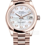 Basic Information Number: m278289rbr-0008; Brand: Rolex; Series: Datejust; Movement Type: Automatic; Gender: Women’s; Movement Model: 2236 Movement Type: Automatic Mechanical; Manufacturer: Rolex; Power Reserve: 55 Hours; Technical Certification: Superlative Chronometer Certification; Appearance: Case Diameter: 31mm; Case Thickness: Not Available; Dial Color: Diamond Set; Dial Shape: Round; Strap Color: Silver; Clasp Type: Concealed Folding Crown Buckle; Case Back: Screw-Down; Weight: Not Available; Water Resistance: 100 Meters; Hour Markers: None; Clasp Spacing: Not Available; Lug Spacing: Not Available; Materials: Case Material: 18k White Gold; Dial Material: Mother-of-Pearl Setting with Butterfly Pattern; Dial with 262 Diamonds and Pink Mother-of-Pearl Butterfly Pattern; Bezel Material: Diamond Set; Crystal Material: Scratch-Resistant Sapphire Crystal with Cyclops Lens for Date Magnification; Crown Material: Screw-Down Twin Lock Double Water Resistance System; Strap Material: 18k White Gold (President Type, Semi-Circular Three-Link Clasp Material: 18k White Gold); Functions: Large Date
