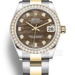 Basic Information Number: m278383rbr-0023; Brand: Rolex; Series: Datejust; Movement Type: Automatic; Gender: Women’s; Movement Model: 2236 Movement Type: Automatic Mechanical; Manufacturer: Rolex; Power Reserve: 55 Hours; Technical Certification: Superlative Chronometer Certification; Appearance: Case Diameter: 31mm; Case Thickness: Not Available; Dial Color: Black; Dial Shape: Round; Strap Color: Two-Tone; Clasp Type: Folding Oysterclasp with 5mm Easylink Extension System; Case Back: Screw-Down Case Back; Weight: Not Available; Water Resistance: 100m; Hour Markers: Diamond-set; Clasp Spacing: Not Available; Lug Spacing: Not Available; Materials: Case Material: Oystersteel; Dial Material: Mother-of-Pearl, 18ct Gold with Diamond Setting; Bezel Material: 18ct Yellow Gold with Diamond Setting; Crystal Material: Scratch-Resistant Sapphire Crystal with Cyclops Lens for Date Magnification; Crown Material: Screw-Down Twin Lock Double Water Resistance System; Strap Material: Gold and Steel (combination of Oystersteel and 18ct Yellow Gold), Two-Tone; Oyster, Three-Link Clasp Material: Oystersteel; Functions: Date Display