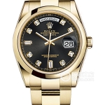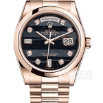 Basic Information: Model Number 118135; Pink Dial with Diamonds; Brand: Rolex; Series: Day-Date; Movement Type: Automatic; Gender: Ladies; Movement Model: 3155; Movement Type: Automatic; Manufacturer: Omega; Technical Certification: Superlative Chronometer; Appearance: Case Diameter: 36mm; Case Thickness: Not Available; Dial Color: Pink; Dial Shape: Round; Strap Color: Smoky Grey; Clasp Type: Folding Oyster Buckle; Case Back: Solid; Weight: Not Available; Water Resistance: 100 meters; Hour Markers: Diamond-set; Clasp Spacing: Not Available; Lug Spacing: Not Available; Materials: Case Material: 18K Rose Gold; Dial Material: Pink with Diamonds, 6 and 9 O’Clock Markers with Bagier Diamonds; Bezel Material: 18K Rose Gold, Fluted Bezel; Crystal Material: Scratch-resistant Sapphire Crystal, Anti-reflective; Cyclops Lens (2.5x) for Date Window; Crown Material: 18K Rose Gold; Strap Material: Leather Strap; Clasp Material: 18K Rose Gold; Functions: Date Display, Day Display