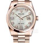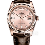 Basic Information: Model No. 118205F Black Dial with Diamonds; Brand: Rolex; Series: Day-Date; Movement Type: Automatic; Gender: Unisex; Movement Model: 3155; Manufacturer: Omega; Technical Certification: Superlative Chronometer; Appearance: Case Diameter: 36mm; Case Thickness: Not Available; Dial Color: Black; Dial Shape: Round; Strap Color: Gold; Clasp Type: Folding Clasp; Case Back: Solid; Weight: Not Available; Water Resistance: 100 meters; Hour Markers: Diamond-set; Clasp Spacing: Not Available; Lug Spacing: Not Available; Materials: Case Material: 18k Rose Gold; Dial Material: Iron Ore with Diamonds; 6 and 9 o’clock markers set with rectangular diamonds; Bezel Material: 18k Rose Gold, Domed Outer Ring; Crystal Material: Sapphire Crystal; Crown Material: 18k Rose Gold; Strap Material: 18k Rose Gold; President Type, Semi-circular Three-Link Clasp Material: 18k Rose Gold; Functions: Date Display, Day Display