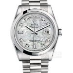 Basic Information: Model Number 118208; Champagne-colored commemorative pattern with diamonds; Brand: Rolex; Series: Day-Date; Movement Type: Automatic; Gender: Unisex; Movement Model: 3155; Movement Type: Automatic; Manufacturer: Omega; Technical Certification: Superlative Chronometer; Appearance: Case Diameter: 36mm; Case Thickness: Not available; Dial Color: Champagne, commemorative pattern; Dial Shape: Round; Strap Color: Gold; Clasp Type: Folding clasp, concealed folding crown clasp; Case Back: Not available; Weight: Not available; Water Resistance: 100 meters; Hour Marker Type: Not available; Clasp Spacing: Not available; Lug Spacing: Not available; Materials: Case Material: 18k gold, domed outer ring; Dial Material: Champagne-colored commemorative pattern with diamonds; 6 and 9 o’clock markers with rectangular diamonds; Bezel Material: Not available; Crystal Material: Scratch-resistant sapphire crystal glass, anti-reflective; Cyclops lens with 2.5x magnification (date window); Crown Material: 18k gold; Strap Material: 18k gold, Oyster, three-link clasp; Clasp Material: 18k gold; Functions: Date display, Day display.