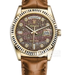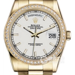 Basic Information: Number 118208 Champagne Diamond Dial; Brand: Rolex; Series: Day-Date; Movement Type: Automatic; Gender: Unisex; Movement Model: 3155 Movement Type: Automatic Mechanical; Manufacturer: Rolex; Frequency: 28,800 vibrations per hour; Power Reserve: 48 hours; Technical Certification: Superlative Chronometer; Appearance: Case Diameter: 36 mm; Case Thickness: Not available; Dial Color: Champagne; Dial Shape: Round; Strap Color: Gold; Clasp Type: Folding Clasp, Concealed Crown Buckle; Case Back: Solid; Weight: Not available; Water Resistance: 100 meters; Hour Markers: Diamond-set; Clasp Spacing: Not available; Lug Spacing: Not available; Materials: Case Material: 18k Gold; Dial Material: 18k Gold; Diamond-set Hour Markers, 6 and 9 o’clock markers; Bezel Material: 18k Gold, Domed Outer Bezel; Crystal Material: Scratch-resistant Sapphire Crystal, Anti-reflective; Cyclops Lens (2.5x) for Date Window; Crown Material: 18k Gold; Strap Material: 18k Gold, Oyster, Three-Link Clasp Material: 18k Gold; Functions: Date Display, Day Display