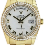 Basic Information: ID 118235 Black Mother-of-Pearl Diamond-Set Dial Oyster Strap Brand: Rolex Series Day-Date Movement Type: Automatic Mechanical Gender: Unisex Movement Model: 3155 Movement Type: Automatic Mechanical Manufacturer: Omega Technical Certification: Superlative Chronometer Certification Appearance: Case Diameter: 36mm Case Thickness: Not Available Dial Color: Black Dial Shape: Round Strap Color: Gold Clasp Type: Folding Clasp Case Back: Not Available Weight: Not Available Water Resistance: 100 meters Hour Marker Type: Diamond-Set Hour Markers Clasp Spacing: Not Available Lug Spacing: Not Available Materials: Case Material: 18k Rose Gold Dial Material: Mother-of-Pearl Diamond-Set Bezel Material: 18k Rose Gold Crystal Material: Sapphire Crystal Glass Crown Material: 18k Rose Gold Strap Material: 18k Rose Gold Oyster Clasp Material: 18k Rose Gold Functions: Day Display, Large Date