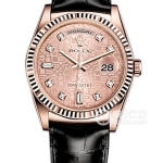 Basic Information: ID 118238; Cognac Dial; Oyster Strap; Brand: Rolex; Series: Day-Date; Movement Type: Automatic; Gender: Men’s; Movement Model: 3155; Movement Type: Automatic; Manufacturer: Omega; Technical Certification: Superlative Chronometer; Appearance: Case Diameter: 36mm; Case Thickness: Not Available; Dial Color: Cognac; Dial Shape: Round; Strap Color: Gold; Clasp Type: Folding Clasp; Case Back: Not Available; Weight: Not Available; Water Resistance: 100 meters; Hour Marker Type: Bat; Clasp Spacing: Not Available; Lug Spacing: Not Available; Materials: Case Material: 18k Gold; Dial Material: Not Available; Bezel Material: Not Available; Crystal Material: Sapphire Crystal; Crown Material: 18k Gold; Strap Material: 18k Gold; Oyster, Three-Link Clasp Material: 18k Gold; Functions: Date Display; Day Display