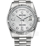 Basic Information Number 118346 Brand: Rolex, Day-Date Series Movement Type: Automatic Gender: Men’s Movement Model: 3155 Movement Type: Automatic Manufacturer: Omega Technical Certification: Superlative Chronometer Appearance: Case Diameter: 36mm Case Thickness: 12mm Dial Color: Pavé Diamonds Dial Shape: Round Strap Color: Silver Clasp Type: Folding Clasp Case Back: Solid Weight: 225g Water Resistance: 100m Hour Markers: Arabic Numerals Clasp Spacing: Not Available Lug Spacing: Not Available Materials: Case Material: 950 Platinum Dial Material: Pavé Diamonds Dial with Enamel Numerals Bezel Material: Diamond Set Crystal Material: Scratch-resistant Sapphire Crystal Glass, Anti-reflective Cyclops Lens (2.5x) Date Window Crown Material: 950 Platinum, Screw-down Twin Lock Double Water Resistance System Strap Material: 950 Platinum, President Type, Semi-circular Three-Link Clasp Material: 950 Platinum Functions: Date Display, Day Display