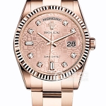 Basic Information: ID: 118348; Brand: Rolex; Series: Day-Date; Movement Type: Automatic; Gender: Men’s; Movement Model: 3155; Movement Type: Automatic; Manufacturer: Rolex; Frequency: 28,800 vibrations per hour; Power Reserve: 48 hours; Technical Certification: Superlative Chronometer; Appearance: Case Diameter: 36mm; Case Thickness: Not available; Dial Color: Silver-grey; Dial Shape: Round; Strap Color: Gold; Clasp Type: Folding Clasp; Case Back: Solid; Weight: Not available; Water Resistance: 100 meters; Hour Markers: Diamond-set; Clasp Spacing: Not available; Lug Spacing: Not available; Materials: Case Material: 18k Gold; Dial Material: Meteorite with Diamonds; Bezel Material: 18k Gold with Diamonds; Crystal Material: Sapphire Crystal; Crown Material: 18k Gold; Strap Material: 18k Gold; President Type, Semi-circular Three-Link Clasp Material: 18k Gold; Functions: Date Display, Day Display