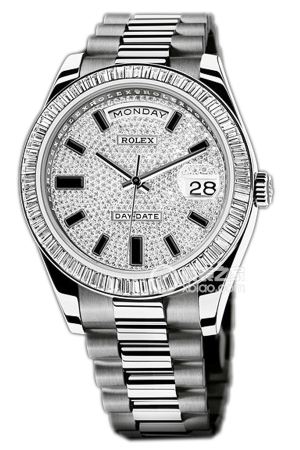 Basic Information: ID: 118348; Brand: Rolex; Series: Day-Date; Movement Type: Automatic; Gender: Men’s; Movement Model: 3155; Movement Type: Automatic; Manufacturer: Rolex; Frequency: 28,800 vibrations per hour; Power Reserve: 48 hours; Technical Certification: Superlative Chronometer; Appearance: Case Diameter: 36mm; Case Thickness: Not available; Dial Color: Silver-grey; Dial Shape: Round; Strap Color: Gold; Clasp Type: Folding Clasp; Case Back: Solid; Weight: Not available; Water Resistance: 100 meters; Hour Markers: Diamond-set; Clasp Spacing: Not available; Lug Spacing: Not available; Materials: Case Material: 18k Gold; Dial Material: Meteorite with Diamonds; Bezel Material: 18k Gold with Diamonds; Crystal Material: Sapphire Crystal; Crown Material: 18k Gold; Strap Material: 18k Gold; President Type, Semi-circular Three-Link Clasp Material: 18k Gold; Functions: Date Display, Day Display
