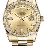 Basic Information: ID 118348; Gold Dial with Diamonds; Brand: Rolex; Series: Day-Date; Movement Type: Automatic; Gender: Men’s; Movement Model: 3155; Movement Type: Automatic; Manufacturer: Rolex; Frequency: 28,800 vibrations per hour; Power Reserve: 48 hours; Technical Certification: Superlative Chronometer; Appearance: Case Diameter: 36mm; Case Thickness: Not Available; Dial Color: Champagne; Dial Shape: Round; Strap Color: Gold; Clasp Type: Folding Clasp; Case Back: Solid; Weight: Not Available; Water Resistance: 100 meters; Hour Markers: Diamond-set; Clasp Spacing: Not Available; Lug Spacing: Not Available; Materials: Case Material: 18k Gold; Dial Material: Champagne with Diamonds; Bezel Material: 18k Gold with Diamonds; Crystal Material: Sapphire Crystal; Crown Material: 18k Gold; Strap Material: 18k Gold; President Type, Semi-circular Three-Link Clasp Material: 18k Gold; Functions: Date Display, Day Display