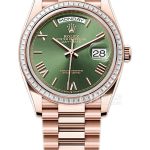 Basic Information Number: 128395TBR-0033 Brand: Rolex Series: Day-Date Movement Type: Automatic Mechanical Gender: Ladies’ Movement: Movement Model: 3255 Movement Type: Automatic Mechanical Manufacturer: Rolex Balance Wheel: Extra Large Inertia Fine Adjustment Balance Wheel Frequency: 28,800 rpm Hairspring: Paramagnetic Blue Parachrom Hairspring Shock Absorption: High-Performance Paraflex Shock Absorption Jewels: 31 Power Reserve: 70 Hours Technical Certification: Superlative Chronometer Appearance: Case Diameter: 36mm Case Thickness: Not Available Dial Color: Green Dial Shape: Round Strap Color: Gold Clasp Type: Folding Clasp Case Back: Not Available Weight: Not Available Water Resistance: 100 meters Hour Marker Type: Bat-shaped Hour Markers, Roman Numerals Clasp Spacing: Not Available Lug Spacing: Not Available Materials: Case Material: 18k Rose Gold Dial Material: Not Available Bezel Material: 18k Rose Gold Diamond Set Crystal Material: Sapphire Crystal Glass Crown Material: 18k Rose Gold Strap Material: 18k Rose Gold Clasp Material: 18k Rose Gold Functions: Date Display, Day Display
