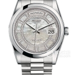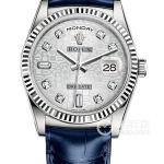 Basic Information Number: m118139-0093 Brand: Rolex Series: Day-Date Movement Type: Automatic Gender: Unisex Movement Model: 3155 Movement Type: Automatic Manufacturer: Omega Technical Certification: Superlative Chronometer Certification Appearance: Case Diameter: 36mm Case Thickness: Not Available Dial Color: Diamond-set Dial Shape: Round Strap Color: Blue Clasp Type: Folding Oyster Buckle Case Back: Solid Weight: Not Available Water Resistance: 100 meters Hour Markers: Arabic numerals Clasp Spacing: Not Available Lug Spacing: Not Available Materials: Case Material: 18k white gold Dial Material: Diamond-set Dial with Enamel Numerals Bezel Material: 18k white gold, fluted bezel Crystal Material: Scratch-resistant sapphire crystal, anti-reflective Cyclops lens for magnified date window Crown Material: 18k white gold, screw-down Twinlock double waterproof system Strap Material: Alligator leather Clasp Material: 18k white gold Functions: Date display, Day display