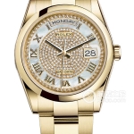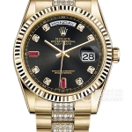 Basic Information Number: m118238-0331 Brand: Rolex Series: Day-Date Movement Type: Automatic Mechanical Gender: Unisex Movement Model: 3155 Movement Type: Automatic Mechanical Manufacturer: Omega Technical Certification: Superlative Chronometer Certification Appearance: Case Diameter: 36mm Case Thickness: Not Available Dial Color: Diamond-set Dial Shape: Round Strap Color: Gold Clasp Type: Concealed Folding Crown Buckle Case Back: Solid Case Back Weight: Not Available Water Resistance: 100 meters Hour Markers: Roman Numerals Clasp Spacing: Not Available Lug Spacing: Not Available Materials: Case Material: 18ct Gold Dial Material: Diamond-set Dial with Black Enamel Numerals Bezel Material: Knurled Outer Bezel Crystal Material: Scratch-resistant Sapphire Crystal, Anti-reflective Cyclops Magnifying Date Window Crown Material: 18ct Gold, Screw-down Twin Lock Double Water Resistance System Strap Material: 18ct Gold, Diamond-set, President Type, Semi-circular Three-link Clasp Material: 18ct Gold Functions: Date Display, Day Display