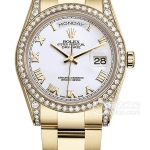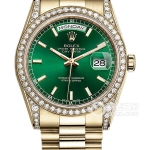 Basic Information Number: m118388-0124 Brand: Rolex Series: Day-Date Movement Type: Automatic Mechanical Gender: Men’s Movement Model: 3155 Movement Type: Automatic Mechanical Manufacturer: Rolex Frequency: 28,800 vibrations per hour Power Reserve: 48 hours Technical Certifications: Superlative Chronometer Certification Appearance: Case Diameter: 36 mm Case Thickness: Not available Dial Color: Black Dial Shape: Round Strap Color: Gold Clasp Type: Concealed Folding Crown Buckle Case Back: Solid Case Back Weight: Not available Water Resistance: 100 meters Hour Markers Type: Diamond-set Hour Markers Clasp Spacing: Not available Lug Spacing: Not available Materials: Case Material: 18k gold Diamond-set Dial Material: Diamond and Ruby-set Bezel Material: Diamond-set Crystal Material: Scratch-resistant Sapphire Crystal, Anti-reflective Cyclops Magnifying Date Window Crown Material: 18k gold Screw-down Twin Lock Double Water Resistance System Strap Material: 18k gold; President type, Semi-circular Three-link Clasp Material: 18k gold Functions: Date Display, Day Display
