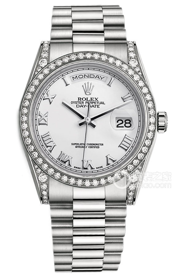 Basic Information Number: m118389-0098 Brand: Rolex Series: Day-Date Movement Type: Automatic Mechanical Gender: Men’s Movement Model: 3155 Movement Type: Automatic Mechanical Manufacturer: Rolex Frequency: 28,800 vibrations per hour Power Reserve: 48 hours Technical Certifications: Superlative Chronometer Certification Appearance: Case Diameter: 36 mm Case Thickness: 12 mm Dial Color: White Dial Shape: Round Strap Color: Silver Clasp Type: Concealed Folding Crown Buckle Case Back: Solid Case Back Weight: Not Available Water Resistance: 100 meters Hour Markers: Roman Numerals Clasp Spacing: Not Available Lug Spacing: Not Available Materials: Case Material: 18ct white gold with diamonds Dial Material: Not Available Bezel Material: Diamond-set Crystal Material: Scratch-resistant sapphire crystal, anti-reflective Cyclops magnifying date window Crown Material: 18ct white gold, screw-down Twin Lock double waterproof system Strap Material: 18ct white gold; President type, semi-circular three-link clasp Material: 18ct white gold Functions: Date display, day display