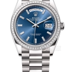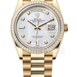 Basic Information Number: m128235-0079 Brand: Rolex Series: Day-Date Movement Type: Automatic Gender: Women’s Movement Model: 3255 Movement Type: Automatic Manufacturer: Rolex Balance Wheel: Extra Large Inertia, Fine Adjustment, Balance Wheel Frequency: 28,800 rpm Hairspring: Paramagnetic Blue: Parachrom Hairspring: Shock-resistant High-performance Paraflex Shock-absorbing device, 31 jewels, 70-hour power reserve, Superlative Chronometer certification. Case diameter: 36mm, Case thickness: Not available. Dial color: White, Dial shape: Round, Strap color: Gold, Clasp type: Concealed folding crown buckle, Case back: Solid, Weight: Not available, Water resistance: 100 meters, Hour markers: Diamond-set, Clasp spacing: Not available, Lug spacing: Not available. Materials: Case material: 18K Everose gold, Dial material: Mother-of-pearl, Bezel material: 18K Everose gold, fluted outer ring, Crystal material: Scratch-resistant sapphire crystal, Cyclops lens for magnification, Date display, Crown material: Screw-down, Twinlock double waterproof system, Strap material: 18K Everose gold, Diamond-set Presidential clasp, Not available. Functions: Day display, Large date.