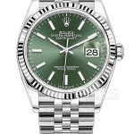 Basic Information Number: m128238-0130 Brand: Rolex Series: Day-Date Movement Type: Automatic Gender: Women’s Movement Model: 3255 Movement Type: Automatic Manufacturer: Rolex Balance Wheel: Extra Large Inertia, Fine Adjustment, Balance Wheel Frequency: 28,800 rpm Oscillations per Hour: Hairspring: Paramagnetic Blue: Parachrom Hairspring: Shock-resistant High-performance Paraflex Shock-absorbing device, 31 jewels, 70-hour power reserve, Superlative Chronometer certification. Case diameter: 36mm, Case thickness: Not available, Dial color: Bright green, Dial shape: Round, Strap color: Gold, Clasp type: Concealed folding crown buckle, Case back: Solid, Weight: Not available, Water resistance: 100 meters, Hour markers: Diamond-set, Clasp spacing: Not available, Lug spacing: Not available, Materials: Case material: 18k gold, Dial material: Not available, Bezel material: 18k gold, fluted outer ring, Crystal material: Scratch-resistant sapphire crystal, Cyclops lens for magnification, Date display, Crown material: Screw-down, Twinlock double waterproof system, Strap material: 18k gold, President model, three-link clasp, Clasp material: Not available, Functions: Day display, Large date.