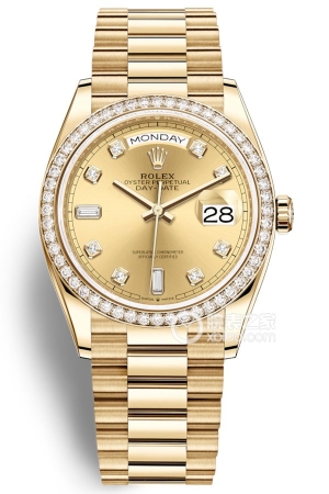 Basic Information Number: m128238-0130 Brand: Rolex Series: Day-Date Movement Type: Automatic Gender: Women’s Movement Model: 3255 Movement Type: Automatic Manufacturer: Rolex Balance Wheel: Extra Large Inertia, Fine Adjustment, Balance Wheel Frequency: 28,800 rpm Oscillations per Hour: Hairspring: Paramagnetic Blue: Parachrom Hairspring: Shock-resistant High-performance Paraflex Shock-absorbing device, 31 jewels, 70-hour power reserve, Superlative Chronometer certification. Case diameter: 36mm, Case thickness: Not available, Dial color: Bright green, Dial shape: Round, Strap color: Gold, Clasp type: Concealed folding crown buckle, Case back: Solid, Weight: Not available, Water resistance: 100 meters, Hour markers: Diamond-set, Clasp spacing: Not available, Lug spacing: Not available, Materials: Case material: 18k gold, Dial material: Not available, Bezel material: 18k gold, fluted outer ring, Crystal material: Scratch-resistant sapphire crystal, Cyclops lens for magnification, Date display, Crown material: Screw-down, Twinlock double waterproof system, Strap material: 18k gold, President model, three-link clasp, Clasp material: Not available, Functions: Day display, Large date.