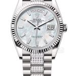 Basic Information Number: m128239-0066 Brand: Rolex Series: Day-Date Movement Type: Automatic Gender: Women’s Movement Model: 3255 Movement Type: Automatic Manufacturer: Rolex Balance Wheel: Extra Large Inertia, Fine Adjustment, Balance Wheel Frequency: 28,800 rpm Hairspring: Paramagnetic Blue: Parachrom Hairspring: Shock-resistant, High-performance Paraflex Shock-absorbing device, 31 jewels, 70-hour power reserve, Superlative Chronometer certification. Case diameter: 36mm, Case thickness: Not available. Dial color: White, Dial shape: Round, Strap color: Silver, Clasp type: Concealed folding crown buckle, Case back: Solid, Weight: Not available, Water resistance: 100 meters, Hour markers: Diamond-set, Clasp spacing: Not available, Lug spacing: Not available. Materials: Case material: 18k white gold, Dial material: Mother-of-pearl, Bezel material: 18k white gold, fluted outer ring, Crystal material: Scratch-resistant sapphire crystal, Cyclops lens for magnification, Date display, Crown material: Screw-down, Twinlock double waterproof system, Strap material: 18k white gold, Diamond-set Presidential clasp, Clasp material: Not available. Functions: Day display, Large date.
