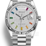 Basic Information Number: m128348rbr-0017 Brand: Rolex Series: Day-Date Movement Type: Automatic Gender: Women’s Movement Model: 3255 Movement Type: Automatic Manufacturer: Rolex Balance Wheel: Extra Large Inertia, Fine Adjustment, Balance Wheel Frequency: 28,800 rpm Oscillations per Hour: Hairspring: Paramagnetic Blue: Parachrom Hairspring Shock Absorption: High Performance Paraflex Shock-absorbing device, 31 jewels, 70-hour power reserve, Superlative Chronometer certification. Case diameter: 36mm, Case thickness: Not available, Dial color: White, Dial shape: Round, Strap color: Gold, Clasp type: Concealed folding crown buckle, Case back: Solid, Weight: Not available, Water resistance: 100 meters, Hour markers: Diamond-set, Clasp spacing: Not available, Lug spacing: Not available, Materials: Case material: 18ct gold, Dial material: White mother-of-pearl set with diamonds, 18ct gold setting with diamonds, 6 and 9 o’clock markers set with square diamonds, Bezel material: Diamond-set, Crystal material: Scratch-resistant sapphire crystal, Crown material: Screw-down Twinlock double waterproof system, Strap material: 18ct gold, President type, three-section arched link clasp material: 18ct gold, Functions: Date display, Day display.