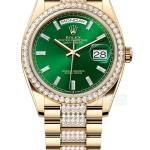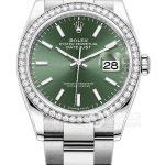 Basic Information Number: m128396tbr-0016 Brand: Rolex Series: Day-Date Movement Type: Automatic Mechanical Gender: Ladies’ Movement: Movement Model: 3255 Movement Type: Automatic Mechanical Manufacturer: Rolex Balance Wheel: Extra Large Inertia Fine Adjustment Balance Wheel Frequency: 28,800 vibrations per hour Hairspring: Paramagnetic Blue Parachrom Hairspring Shock Absorption: High-Performance Paraflex Shock Absorption Jewels: 31 Power Reserve: 70 hours Technical Certifications: Superlative Chronometer Certification Appearance: Case Diameter: 36 mm Case Thickness: Not Available Dial Color: Blue Dial Shape: Round Strap Color: Silver Clasp Type: Concealed Folding Crown Buckle Case Back: Solid Case Back Weight: Not Available Water Resistance: 100 meters Hour Marker Type: Diamond-set Hour Markers Clasp Spacing: Not Available Lug Spacing: Not Available Materials: Case Material: Platinum Dial Material: Turquoise, with 18K gold hour markers set with 32 diamonds and 18K gold Roman numerals VI and IX set with 24 diamonds. Platinum bezel with diamond-set outer ring; scratch-resistant sapphire crystal with Cyclops lens for magnification of the date; screw-down crown with a Twinlock double waterproof system; platinum bracelet; President model; three-link clasp; currently no functions including date and day display.