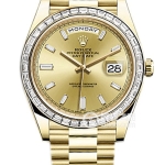 Basic Information Number: m228345rbr-0011 Brand: Rolex Series: Day-Date Movement Type: Automatic Gender: Men’s Movement Model: 3255 Movement Type: Automatic Manufacturer: Rolex Balance Wheel: Extra Large Inertia, Fine Adjustment, Balance Wheel Frequency: 28,800 rpm Oscillations per Hour: Hairspring: Paramagnetic Blue: Parachrom Hairspring: Shock-resistant High-performance Paraflex Shock-absorbing device, 31 jewels, 70-hour power reserve, Superlative Chronometer certification. Case diameter: 40mm, Case thickness: Not available, Dial color: Olive green, Dial shape: Round, Strap color: Gold, Clasp type: Concealed folding crown buckle, Case back: Not available, Weight: Not available, Water resistance: 100 meters, Hour markers: Bat markers, Roman numerals, Clasp spacing: Not available, Lug spacing: Not available, Materials: Case material: 18k rose gold, Dial material: Not available, Bezel material: 18k rose gold with diamonds, Crystal material: Sapphire crystal glass, anti-reflective, Cyclops lens with magnifying date window, Crown material: Screw-down Twinlock double waterproof system, Strap material: 18k rose gold, President type, semi-circular three-link clasp material: 18k rose gold, Functions: Date display, Day display.