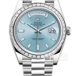 Basic Information Number: m228396tbr-0002 Brand: Rolex Series: Day-Date Movement Type: Automatic Gender: Men’s Movement Model: 3255 Movement Type: Automatic Manufacturer: Rolex Balance Wheel: Extra Large Inertia, Fine Adjustment, Balance Wheel Frequency: 28,800 rpm Hairspring: Paramagnetic Blue: Parachrom Hairspring: Shock-resistant High-performance Paraflex Shock-absorbing device, 31 jewels, 70-hour power reserve, Superlative Chronometer certification. Case diameter: 40mm, Case thickness: Not available, Dial color: Ice blue, Dial shape: Round, Strap color: Silver, Clasp type: Concealed folding crown buckle, Case back: Solid, Weight: Not available, Water resistance: 100 meters, Hour markers: Bat markers/diamond-set, Clasp spacing: Not available, Lug spacing: Not available. Materials: Case material: Platinum, Dial material: Diamond-set, Bezel material: Diamond-set, Crystal material: Scratch-resistant sapphire crystal with Cyclops lens for magnification, Date display, Crown material: Screw-down, Twinlock double waterproof system, Strap material: Platinum, President model, Three-link clasp, Clasp material: Platinum. Functions: Date display, Day display.