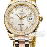 Basic Information Number: 18948-72748TRIDOR-8R2B Brand: Rolex Series: Day-Date Movement Type: Automatic Mechanical Gender: Ladies’ Movement: Movement Model: 3155 Movement Type: Automatic Mechanical Manufacturer: Rolex Frequency: 28,800 vibrations per hour Power Reserve: 48 hours Technical Certifications: Superlative Chronometer Certification Appearance: Case Diameter: 39 mm Case Thickness: Not available Dial Color: Silver-white Dial Shape: Round Strap Color: Two-tone Clasp Type: Folding Clasp Case Back: Solid Case Back Weight: Not available Water Resistance: 100 meters Hour Marker Type: Diamond-set Hour Markers Clasp Spacing: Not available Lug Spacing: Not available Materials: Case Material: 18k Gold Dial Material: Not available Bezel Material: 18k Gold with Diamonds Crystal Material: Sapphire Crystal Crown Material: 18k Gold Strap Material: 18k Gold/18k Rose Gold/18k White Gold; Two-tone Clasp Material: Not available Functions: Date Display, Day Display